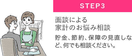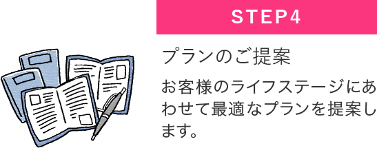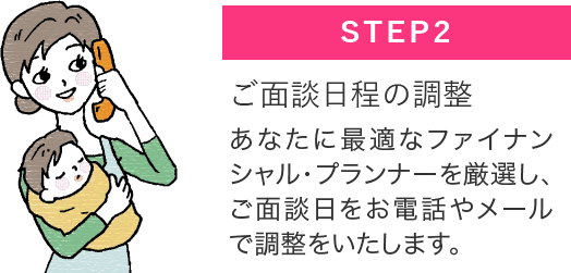 最適なファイナンシャル・プランナーとあなたを繋ぎます。そして、経験豊富なファイナンシャル・プランナーが数ある保険商品を、返戻率、月々の保険料、保障内容等を含めて比較し、ご家族の将来に最適なプランを提案します。
